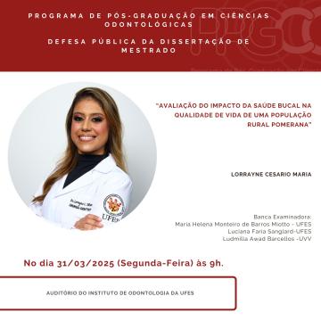 A Defesa da Dissertação de Mestrado será realizada no dia 31/03/2025 as 9h, no Auditório do Instituto de Odontologia da UFES